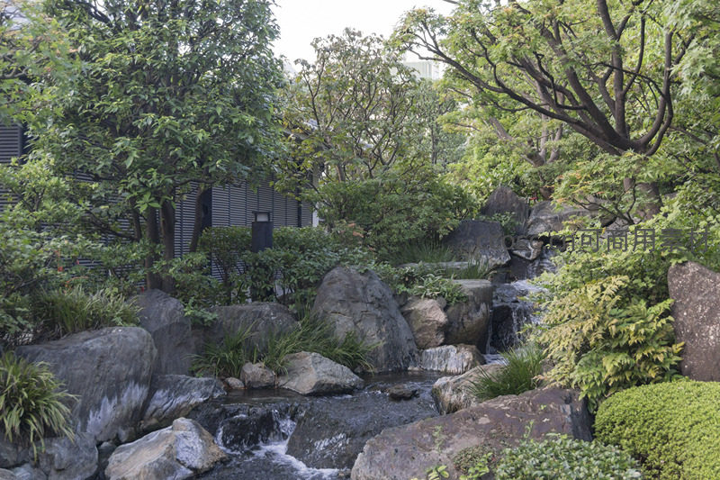 精心设计的日式庭院中,清澈的溪水在嶙峋的岩石间蜿蜒流淌,周围环绕着苍翠的树木和修剪整齐的灌木,背景现代建筑与自然和谐共生,意境悠远。