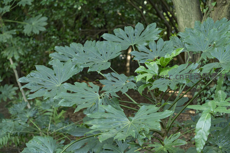 阳光透过林间,八角金盘宽大的叶片舒展着,叶脉清晰,边缘有自然裂口,充满原始森林的静谧与生命力。