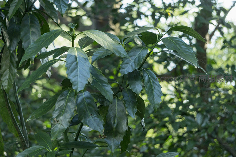 嫩绿的咖啡树叶在柔和光线下显得格外鲜亮,叶片厚实光滑,背景是朦胧的林木,传递出一种清新自然的田园气息。