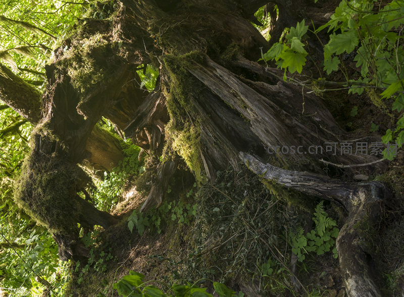 苍老的树根盘结扭曲,表面布满青翠苔藓,周围散落着蕨类和落叶,展现出原始森林中岁月沉淀的生命力与沧桑感。