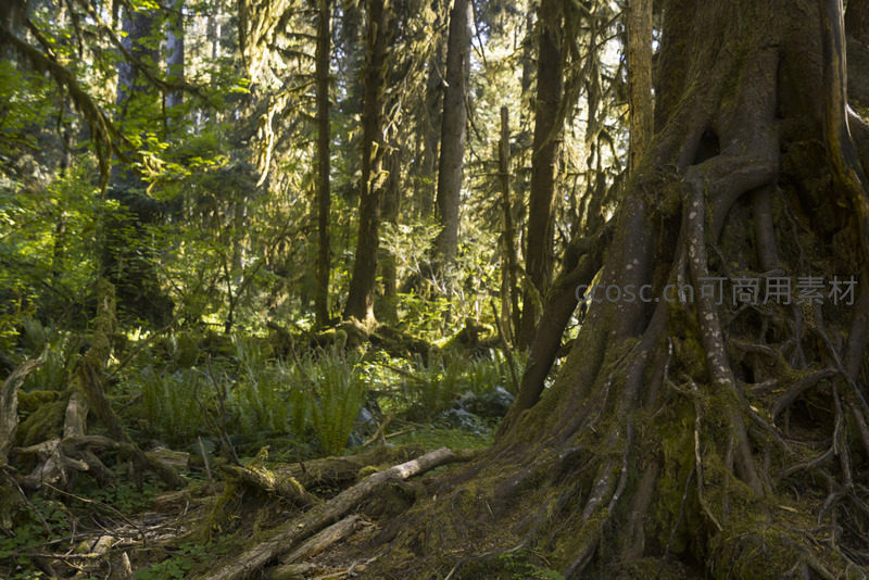 阳光穿透的古老森林,苔藓覆盖巨树根系