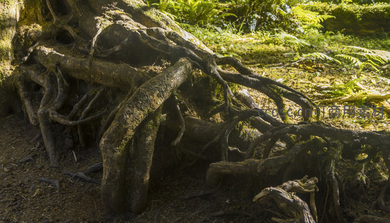 镜头聚焦于一棵古树粗壮而扭曲的根部,根系如龙蛇般在泥土中蔓延,表面附着青苔,在斜射的阳光下形成明暗对比,展现出大自然鬼斧神工的力量与美感。