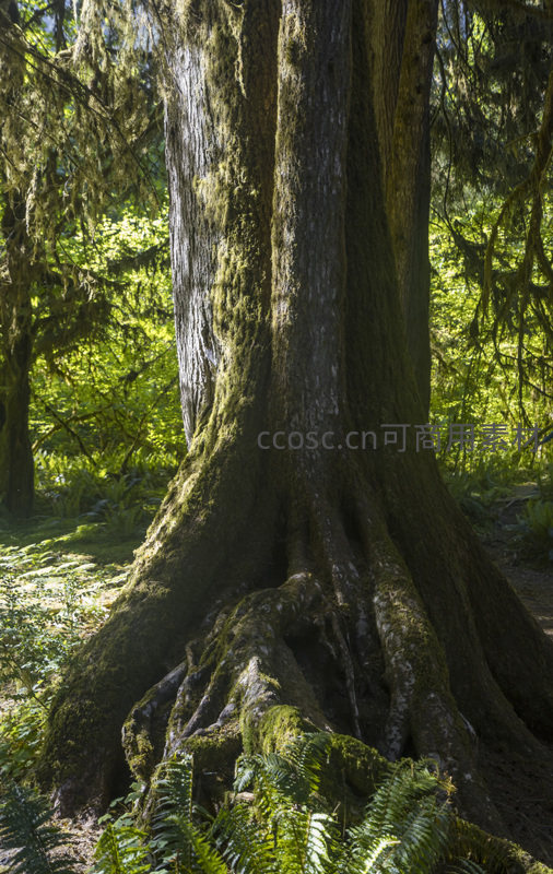 在幽静的原始森林中,一棵巨树的根部盘根错节,布满青翠苔藓,阳光透过树冠洒落,营造出神秘而宁静的自然氛围。
