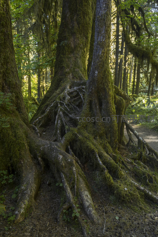 在茂密的森林深处,几棵古树的根系相互缠绕、延伸,覆盖着厚厚的苔藓,周围绿植环绕,呈现出一片原始而充满生命力的景象。