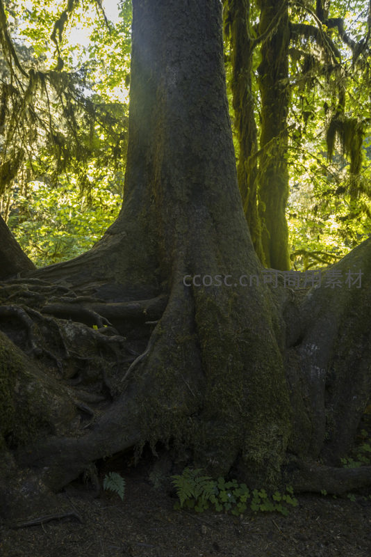 温暖的阳光穿过浓密的树冠,斜照在古树苍劲的根部,苔藓在光线下泛着绿意,整个画面宁静祥和,仿佛时间在此刻凝固。