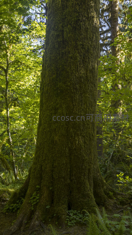 高大古老的树木矗立在茂密森林中,树干与根部被厚厚的青苔覆盖,阳光透过树叶洒下斑驳光影,营造出宁静而神秘的自然氛围。