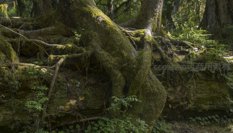 盘根错节的树根紧紧贴附于岩石之上,被柔软苔藓温柔覆盖,阳光从缝隙中斜射而入,凸显出森林深处生命与土地紧密相连、生生不息的壮丽图景。