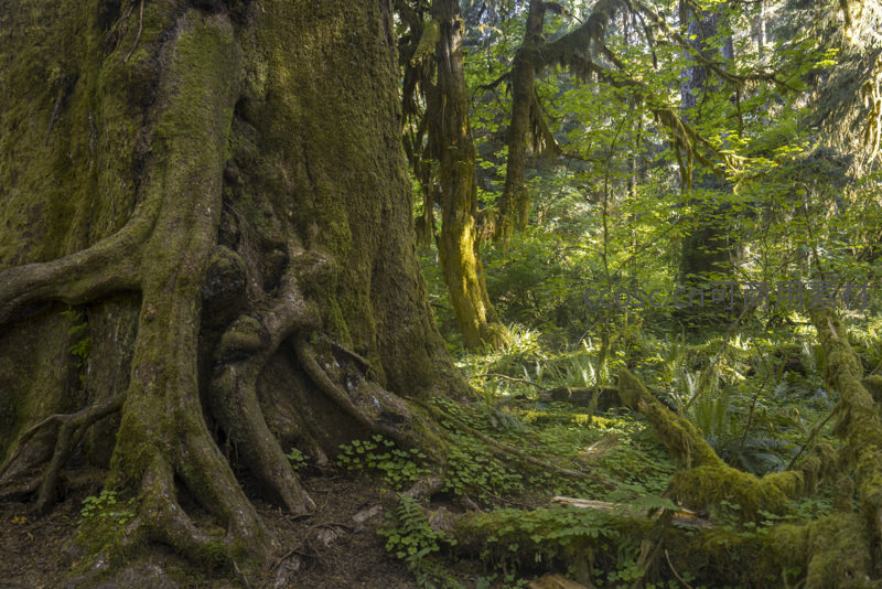 阳光穿过层层叠叠的树冠,在布满苔藓的树干和根系上投下温暖光斑,四周蕨类与灌木丛生,整个画面洋溢着清新湿润、充满活力的原始森林气息。