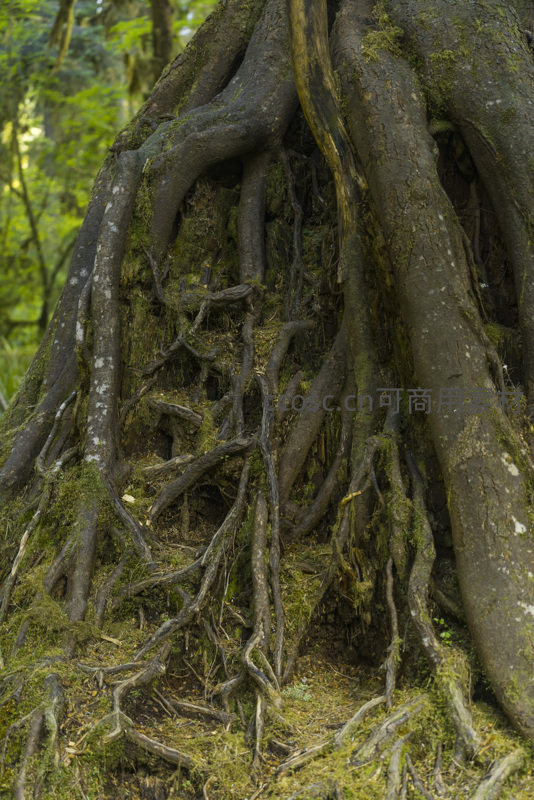 深林中,庞大的根系网络被浓密苔藓包裹,在斑驳光影下显得神秘而古老,仿佛是大地深处的生命脉络,静默而有力。