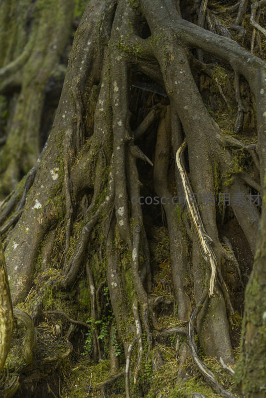 盘根错节树根交织,微距镜头下纹理清晰