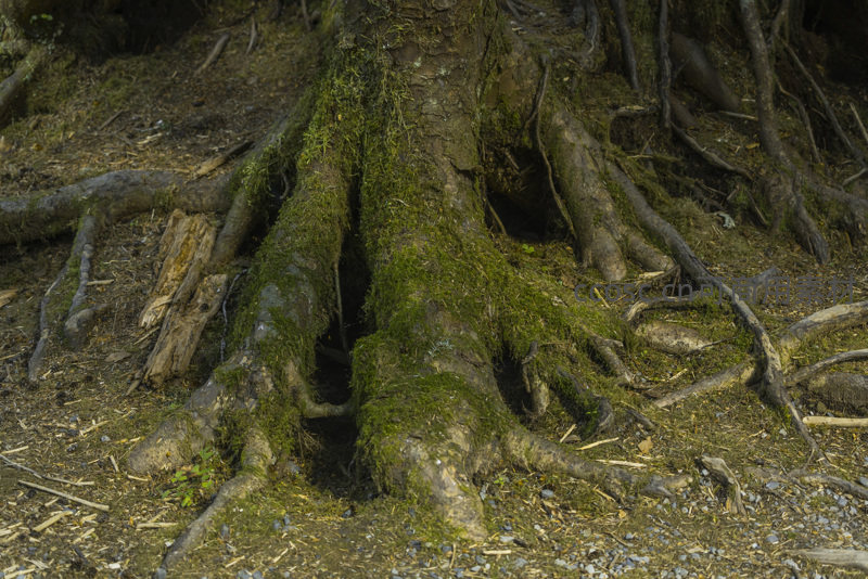 苔藓点缀粗壮树根,林间光影斑驳如画