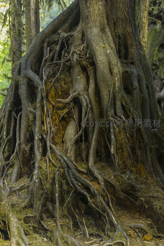 阳光穿透林间,照亮了这棵古树盘根错节、布满青苔的庞大根系,展现了大自然原始而坚韧的生命力。
