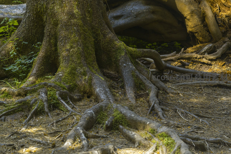 覆盖青苔的树根蜿蜒地面