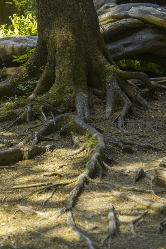 金色的阳光洒落在林间裸露的树根网络上,根须在落叶和泥土间蔓延,构成了一幅宁静而富有生命力的自然画卷。