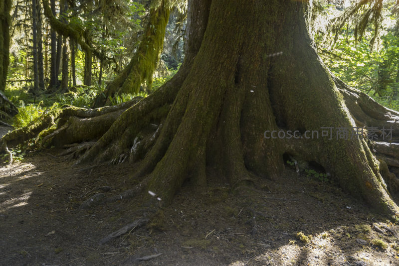 一棵参天古树的底部根系庞大而稳固,被翠绿苔藓温柔包裹,在林间柔和光线下显得庄严而神秘,仿佛守护着森林千年的秘密与宁静。