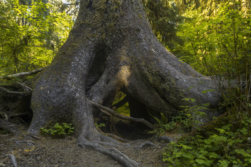 巨大的树根天然形成拱门,阳光从缝隙中倾泻而下,照亮了脚下的泥土与周围的低矮灌木,营造出神秘而原始的森林探险氛围。