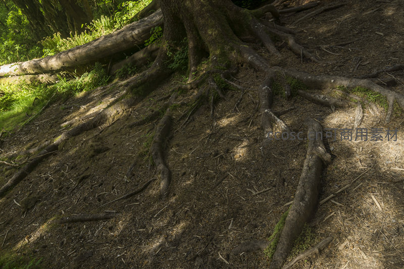 树根如龙蛇般蜿蜒于松软的林地,阳光穿透树叶形成明暗交错的光斑,泥土与枯枝构成大地肌理,传递出森林深处的原始与安宁。