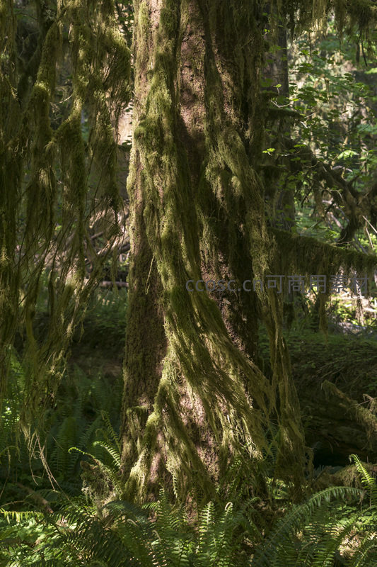 特写镜头捕捉到树干上垂落的浓密青苔,在斑驳阳光下如绿色丝帘般飘逸,与底部翠绿蕨类相映成趣,尽显森林湿润环境下的细腻生机。