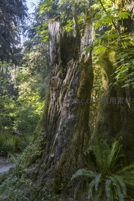 一截饱经风霜的朽木残桩挺立在茂密林间,表面斑驳开裂,覆满青苔,无声诉说着岁月与自然更迭。