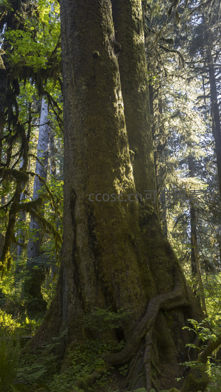 一棵巨大的古老树木矗立于密林之中,阳光穿透叶隙洒在其布满苔藓的树干和盘错根系上,营造出神圣而宁静的氛围。