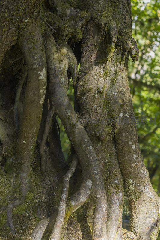 粗壮树根如巨蟒般缠绕交错,表面覆盖着湿润青苔,在柔和光线下展现出原始森林中根系与微生物和谐共存的生态奇观。