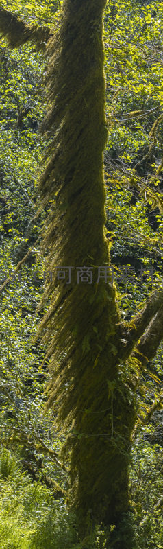 细腻的苔藓如绿色瀑布般垂挂在树干上,阳光勾勒出其柔软纹理,营造出神秘而宁静的森林微观世界氛围。