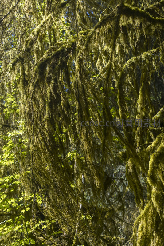 阳光透过茂密树冠,洒在覆盖着厚厚苔藓的古老树枝上,营造出神秘而宁静的森林氛围,展现了大自然原始生态的壮丽与和谐。