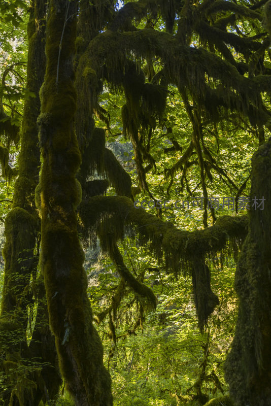 阳光穿过层层叠叠的苔藓覆盖的树枝,在林间投下斑驳陆离的光影,仿佛置身于一个由绿色编织而成的神秘迷宫,充满生机与诗意。
