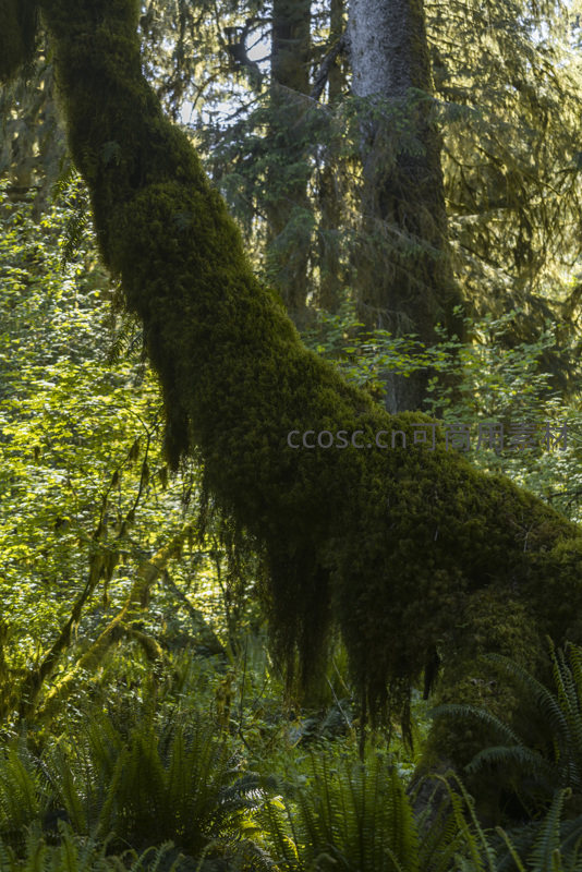 苔藓覆盖的森林巨木,阳光穿透绿意盎然