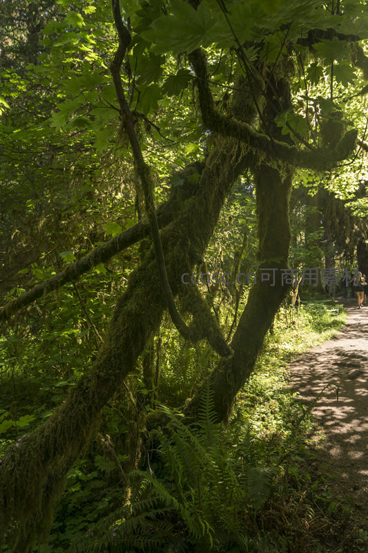 蜿蜒小径边,枝干被厚实苔藓温柔覆盖,阳光穿过叶隙投下柔和光斑,远处行人点缀其间,尽显林间漫步的惬意与诗意。