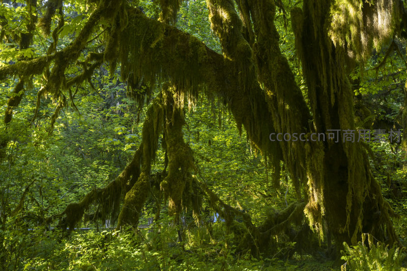 粗壮树干与伸展枝条披满翠绿苔藓,在阳光照射下熠熠生辉,背景绿意盎然,营造出如梦境般的原始森林秘境,令人流连忘返。