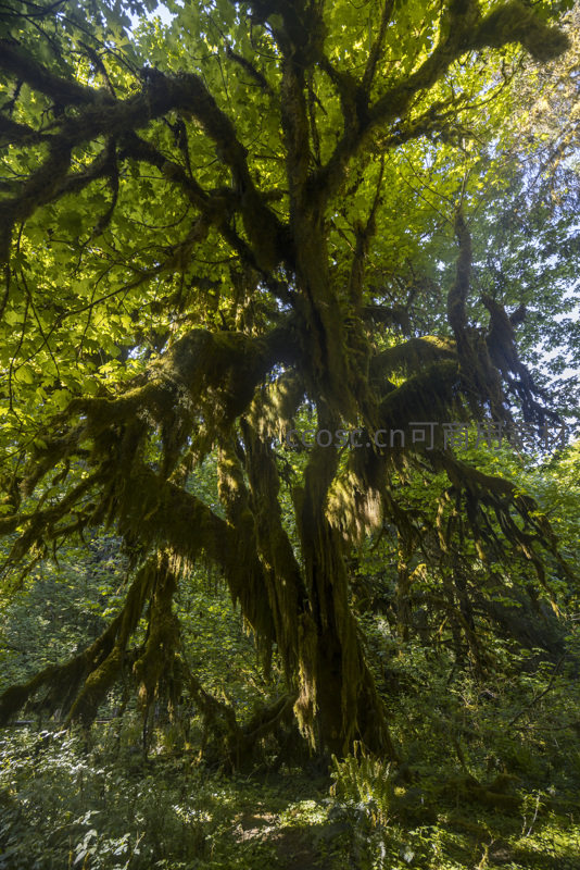 高耸入云的古树枝干盘错,全身披覆翠绿苔藓,在斑驳阳光下形成一幅壮丽的自然画卷,尽显森林的雄伟与幽深。