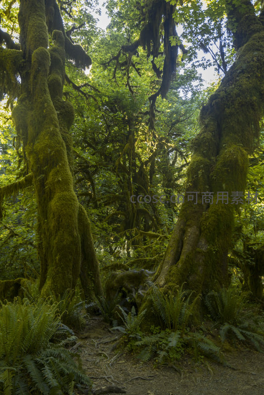 阳光穿透茂密树冠,洒在布满青苔的巨树与蕨类植物上,营造出静谧而神秘的原始森林氛围,展现大自然的蓬勃生机与岁月痕迹。
