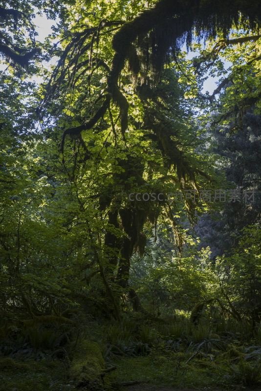粗壮枝干上垂落着浓密苔藓,阳光斜射穿过叶隙,在地面与树身投下斑驳光影,构成一幅充满诗意与野性的森林生态画卷。
