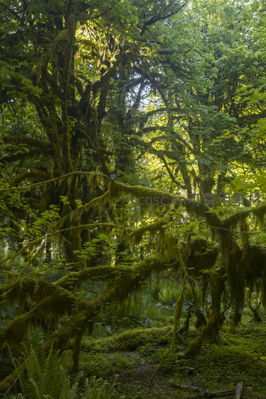 阳光透过密集树冠,在布满苔藓的枝干与地面间投下斑驳光点,形成一条通往森林深处的光影走廊,充满神秘与自然的和谐之美。