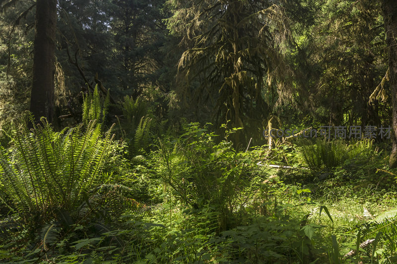 茂密的原始森林中,阳光透过树冠洒在覆盖着青苔的地面和繁盛的蕨类植物上,营造出静谧而生机勃勃的自然氛围。
