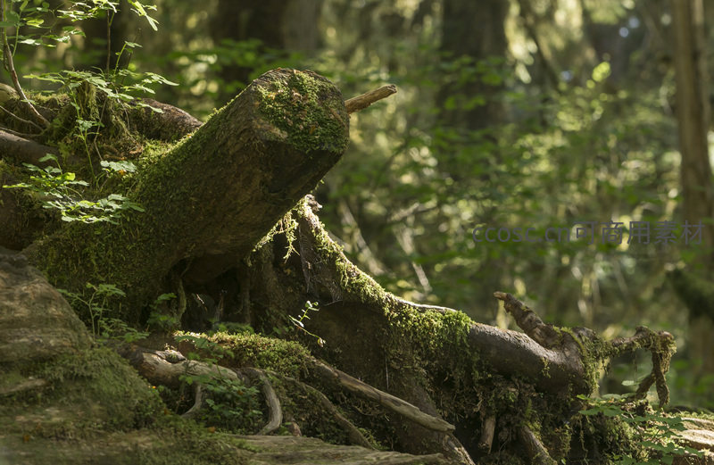 粗壮的树根盘踞于林间,表面覆盖着厚厚的翠绿苔藓,展现了森林中生命与时间交织的静美画面,充满原始野性。