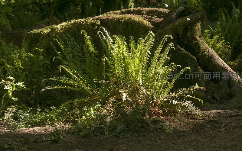 古老的树根如雕塑般横卧,其旁蕨类植物在阳光照射下熠熠生辉,绿意盎然,构成一幅充满生命力与岁月痕迹的森林画卷。