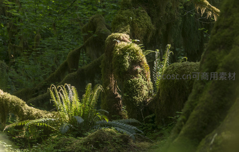 古老的树根被厚厚的苔藓温柔包裹,新生的蕨类在缝隙中探出头来,阳光从上方洒下,勾勒出森林深处的生命轮回。