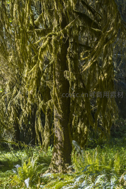 一棵高大的树木被长须般的苔藓完全覆盖,仿佛披着绿色的帘幕,在阳光照射下显得格外神秘而庄严,充满原始森林的气息。