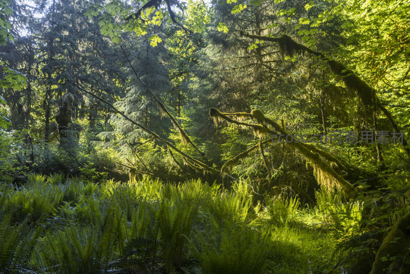 枝干垂挂苔藓,阳光洒满蕨类丛生的森林深处