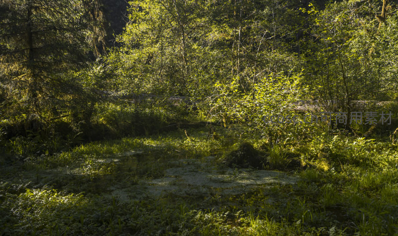 阳光穿透林间湿地,绿意盎然生机勃勃