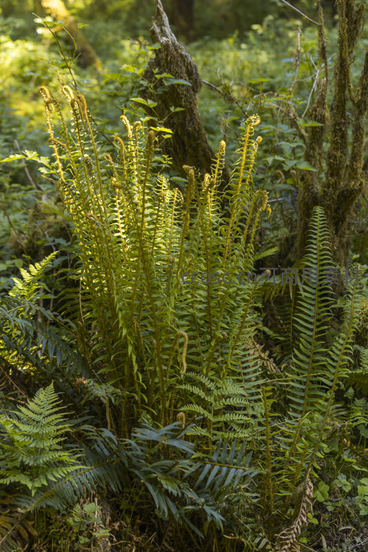 高耸的蕨类植物在斑驳阳光下舒展叶片,背景是幽深的林木,呈现出原始森林中蓬勃生长的绿色韵律与自然之美。
