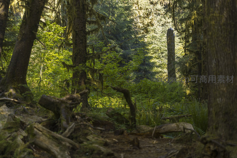 林间小道两侧倒木与绿植交错,远处高耸入云的巨木沐浴在柔和阳光中,营造出深邃、庄严又充满生命力的森林意境。