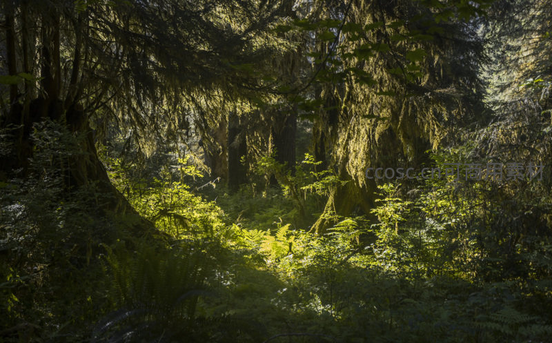 茂密的原始森林中,阳光透过树冠洒下斑驳光影,覆盖着厚厚苔藓的巨木与翠绿蕨类交织,营造出如梦似幻的自然秘境。