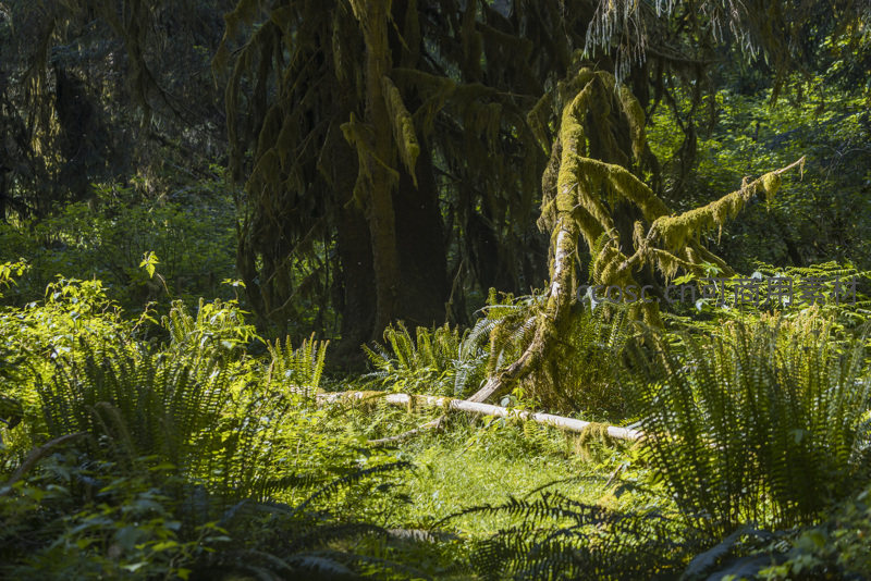 一根覆满青苔的倒木横卧在阳光照射的林间空地上,周围蕨类繁茂,光影斑驳,展现了森林生态系统中生命循环的静美。