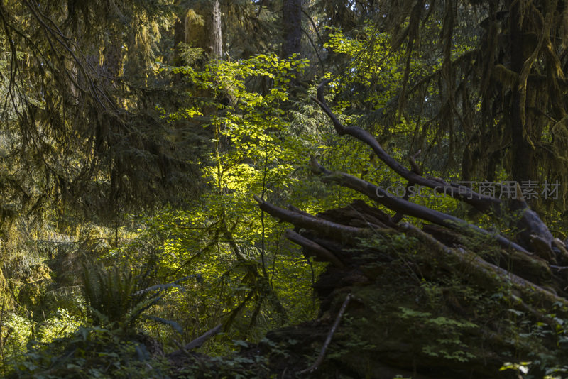 林间光影交织的古老树影