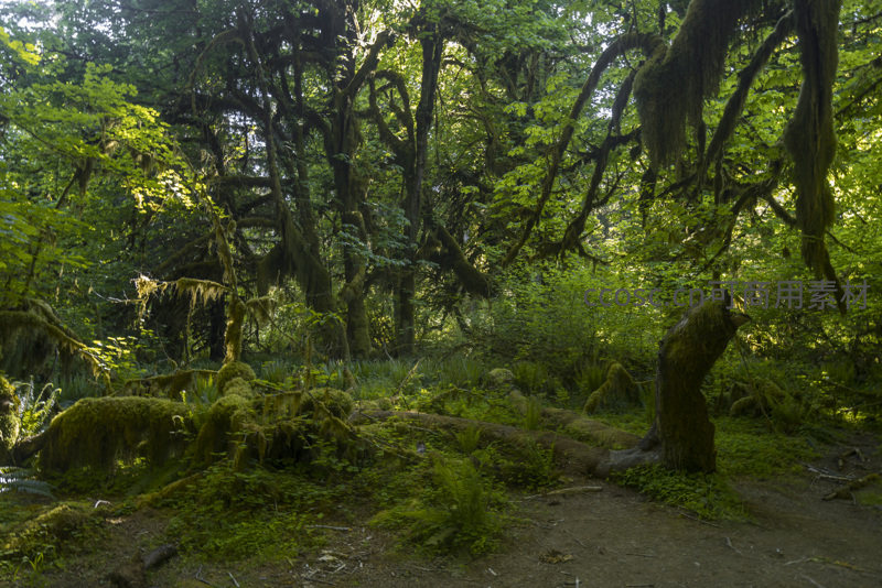 阳光穿过层层叠叠的树冠,在布满苔藓的林间空地上投下跳跃的光斑,一条土路静静延伸,邀请人们沉浸于这片葱郁的绿色世界。