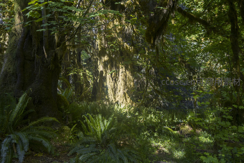 茂密的原始森林中,高大的古树被厚厚的苔藓包裹,阳光透过浓密的枝叶洒下斑驳光影,营造出静谧而神秘的氛围。