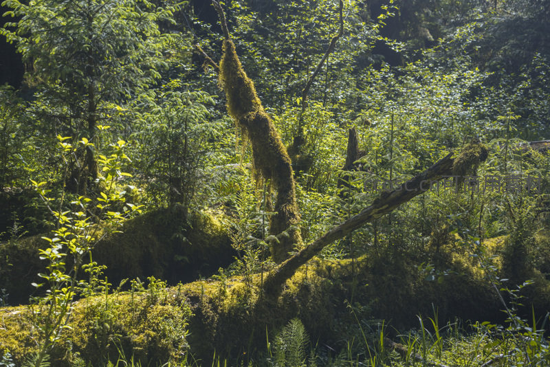 一根横卧的枯木被翠绿苔藓完全覆盖,周围是生机勃勃的灌木和小树,在斜射阳光下呈现出层次丰富的绿色世界。
